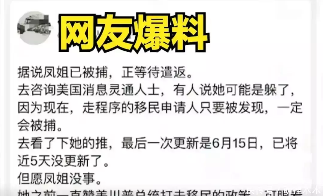 有消息称,凤姐或是因申请庇护遭拒,进而面临驱逐,有说她已提前得知消息躲藏,也有说法称凤姐已经被捕等待遣返,但凤姐的社交账号已经于6月15日起停更,也暂无官方平台证实此事,可大家都没想到凤姐十几年的赴美生涯竟以这样一种方式结束。