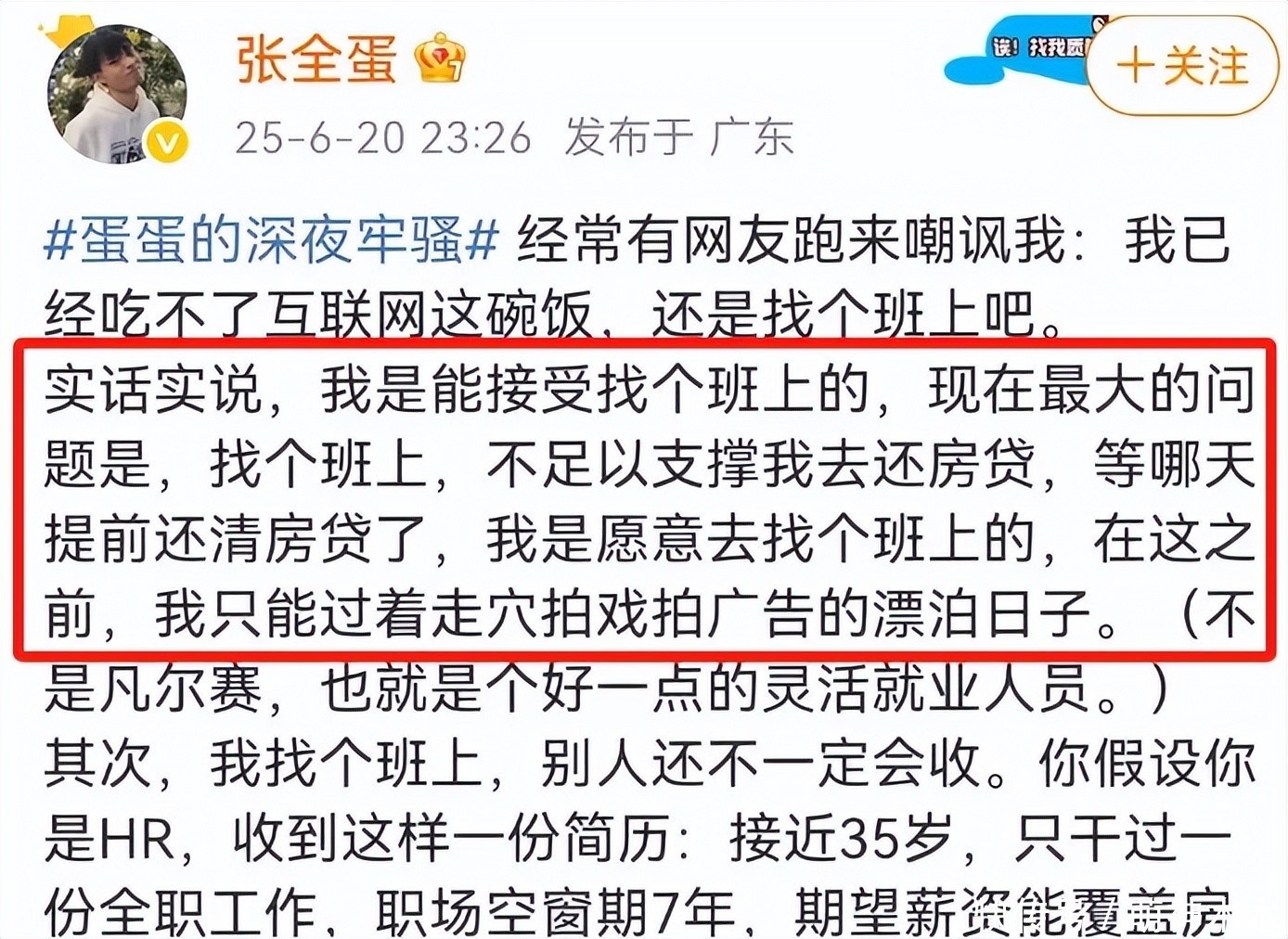 为了负担每月2万的房贷,张全蛋重拾老本行,打打广告做做测评,还在某些综艺中“打酱油”,他还自曝自己收入骤减,某个社交账号的收入挂靠在了前公司上,自己分文不得,而张全蛋近期博文的评论数几乎都保持在两位数,他自己也坦然接受已经过气的现实,甚至还遭到了很多人的打击。